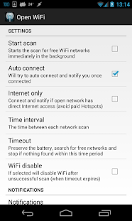 ✔ Seleccione si desea recibir notificación sólo si hay un punto de acceso gratuito a disposición (sin costo alguno, sin VPN de acceso, los inicios de sesión de la página web requerida etc.). Por ejemplo: lugares como Starbucks o aeropuertos, para nombrar unos pocos, requieren confirmación de las condiciones a través de la página de inicio de sesión - desactivar la casilla de verificación "sólo Internet" para encontrar estos puntos calientes!
